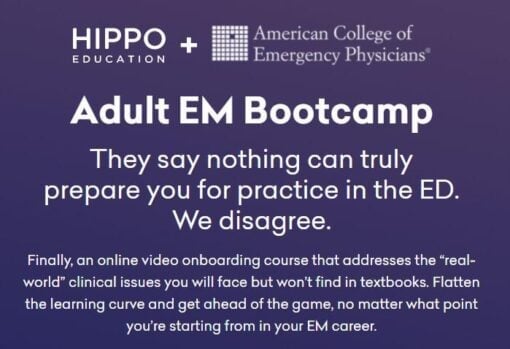 Introduction to Adult EM Bootcamp + The Practice of Emergency Medicine (Hippo) 2020 Adult Emergency Medicine Bootcamp combines the educational excellence you expect from Hippo with the reputation of the American College of Emergency Physicians to give you a comprehensive education supported by one of the most respected names in emergency medicine.