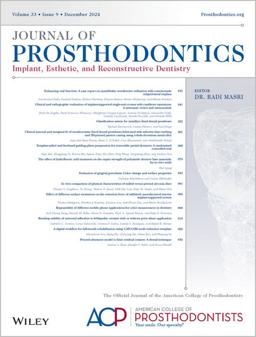 The Journal of Prosthodontics promotes the advanced study and practice of prosthodontics, implant, esthetic and reconstructive dentistry. It is the official journal of the American College of Prosthodontists, the American Dental Association-recognized voice of the Specialty of Prosthodontics. The Journal of Prosthodontics serves both researchers and practicing clinicians by providing a forum for the presentation and discussion of evidence-based prosthodontic research, techniques, and procedures. The objective of the Journal of Prosthodontics is to facilitate the effective transmission of new and innovative prosthodontic-related research from the laboratory to the practicing clinician. The journal publishes original scientific articles presenting information that is new and relevant to prosthodontics. Additionally, it publishes reports of innovative techniques, reviews of new instrumentation and products, new uses for existing material, new instructional methodologies, work in progress and practice management issues, instructive case reports, and announcements of importance to the prosthodontic community.