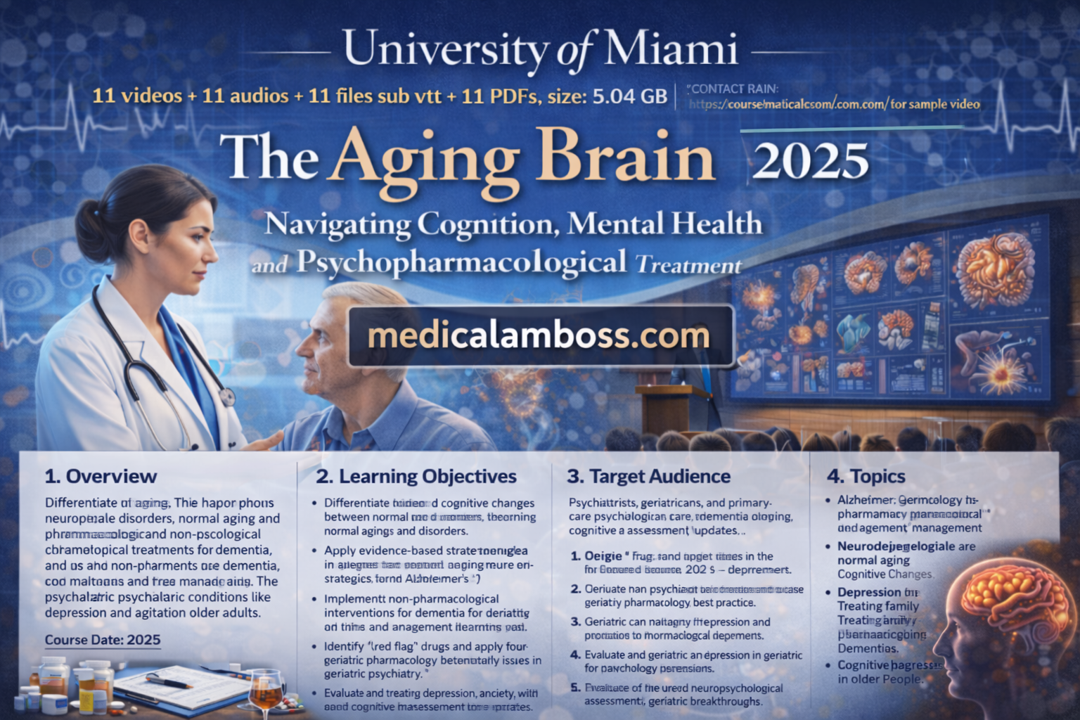 The University of Miami The Aging Brain Navigating Cognition, Mental Health and Psychopharmacological Treatment 2025 provides an in-depth review of geriatric mental health care. The course focuses on differentiating normal aging from neurodegenerative disorders, optimizing pharmacological and non-pharmacological treatments for dementia, and managing complex psychiatric conditions like depression and agitation in older adults.